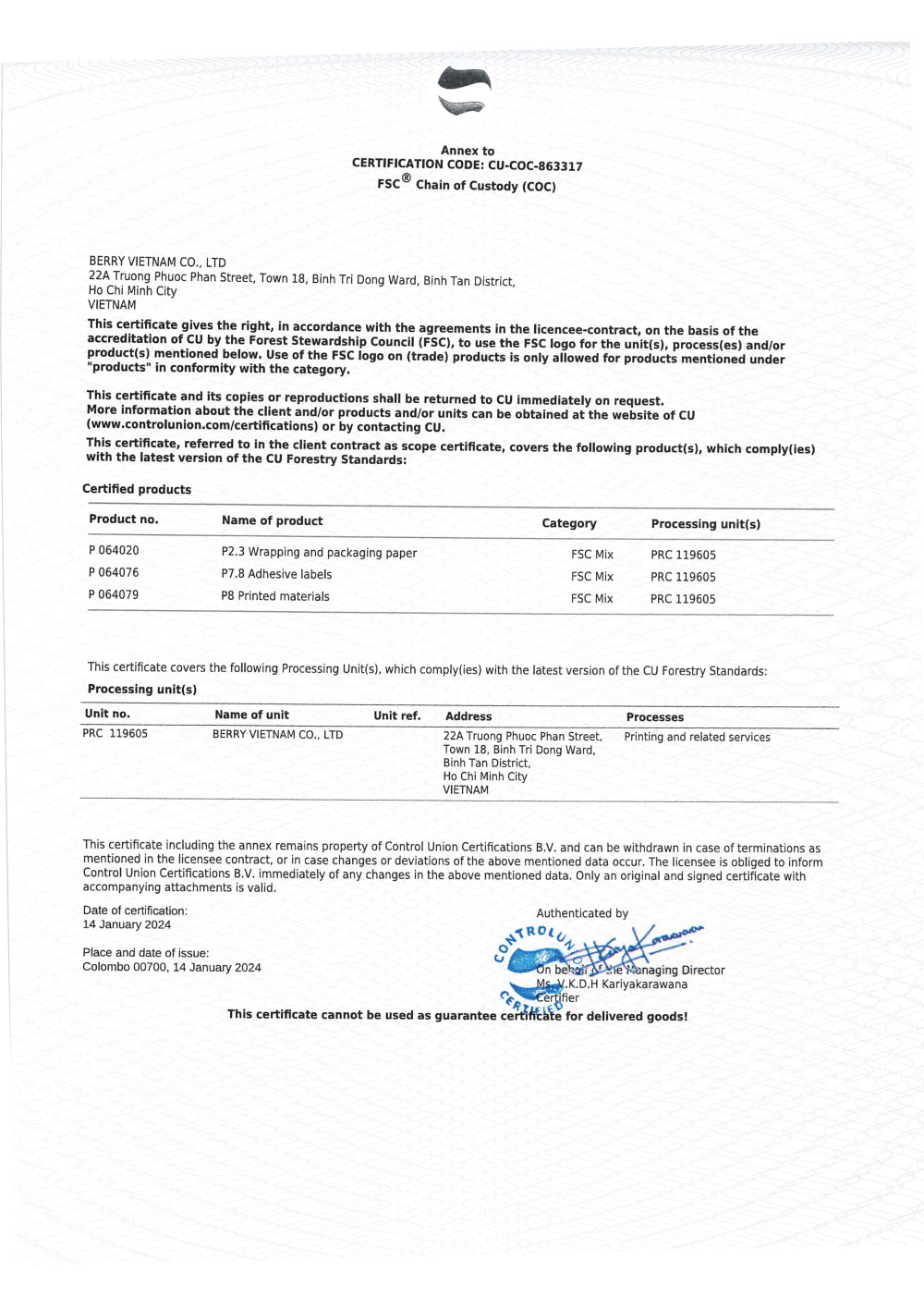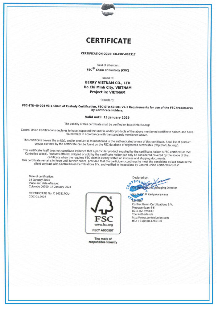 To assure you—and more importantly, to contribute to environmental and ecological protection—Berry pursued FSC® CoC certification as a pledge that all materials used in our production come from FSC®-certified forests.